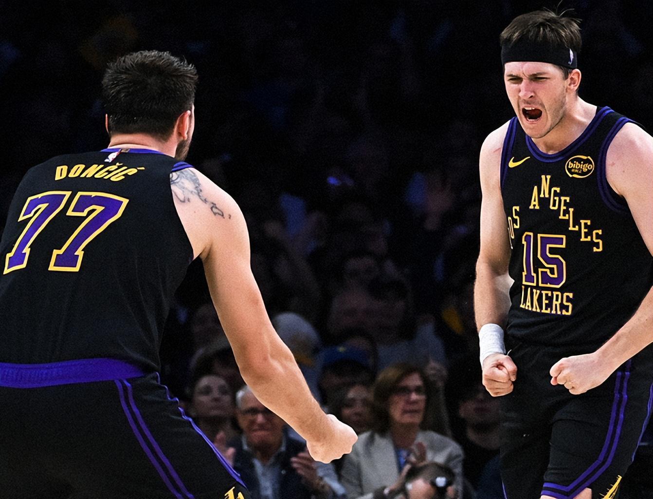 反观湖人,即便没有老詹,卢卡和里夫斯双核还是得分组织一把抓,把进攻支棱得井井有条。里夫斯出战38分钟,20投10中(三分球10中4),罚球9中7,砍下31分+7篮板+8助攻,场上正负值为+18;卢卡出战34分钟,24投11中(三分球12中4),罚球6中5,轰下31分+11篮板+11助攻+2抢断+1盖帽,场上正负值高达+20,冠绝全场。与此同时,卢卡一战刷爆多项NBA纪录,并打破了一项由科比保持的NBA纪录。